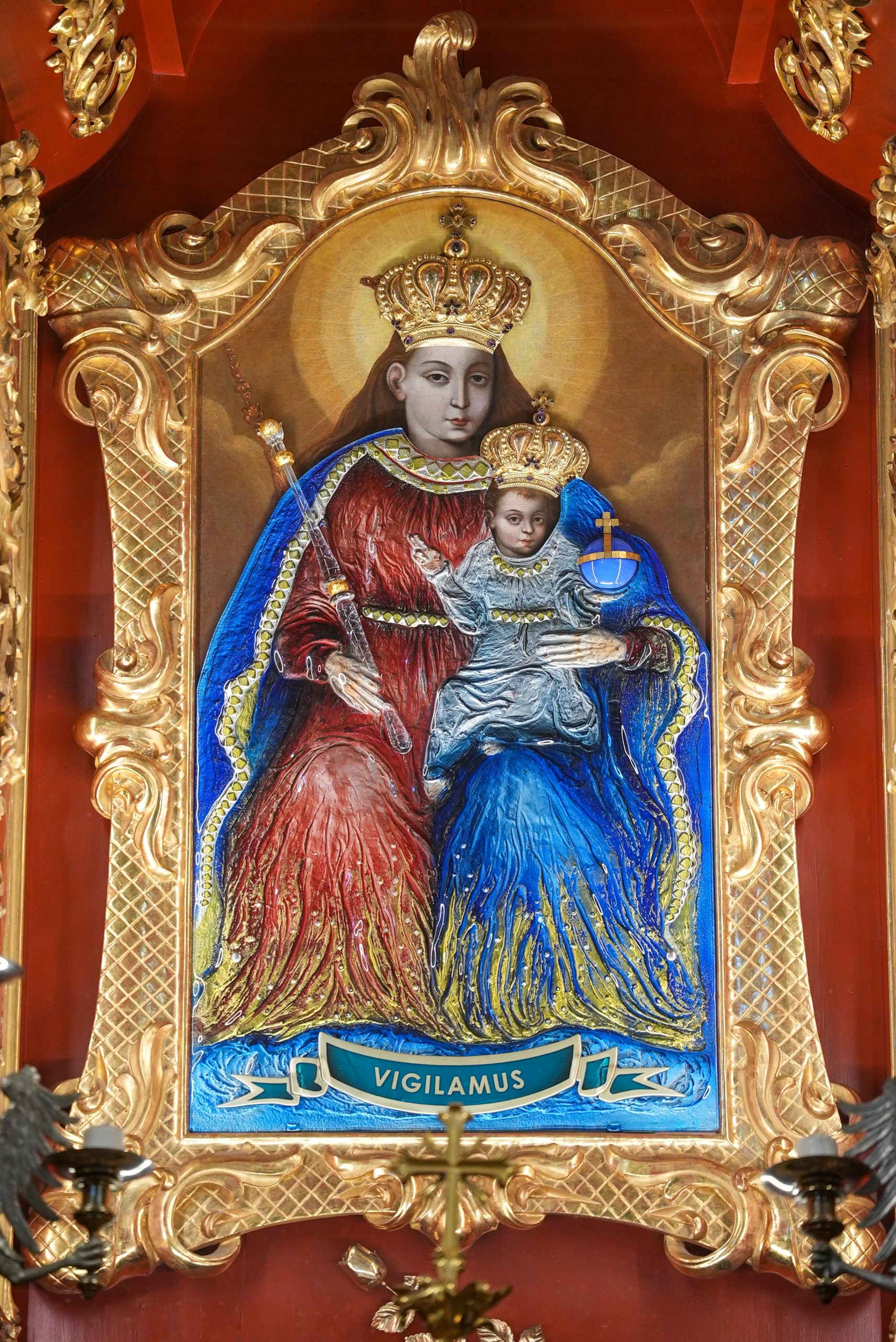 Nieznany artysta przedstawił Maryję jako Królową. Jej tron stanowią obłoki. W prawej dłoni trzyma berło, a na lewej ręce spoczywa Dzieciątko Jezus, które prawą dłonią błogosławi, a w lewej trzyma kulę ziemską.